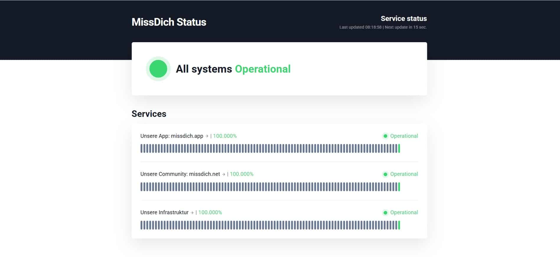 Im (hoffentlich nie eintretenden) Notfall, wenn unsere Hauptseite nicht erreichbar ist, findest du dort immer den aktuellen technischen Status von MissDich. So bleibst du unabhängig informiert – egal, was passiert.